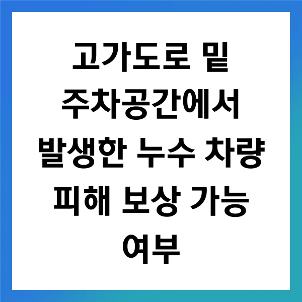 고가도로 밑 주차공간에서 발생한 누수로 인한 차량 피해는 여러 가지 법적 책임과 함께 보상 청구가 가능한 상황 입니다. 그러나 보상을 받기 위해서는 명확한 절차와 필요 서류 를 준비해야 합니다. 이를 통해 피해자의 권리를 보장하고, 적정한 보상을 받을 수 있는 기반을 마련할 수 있습니다.