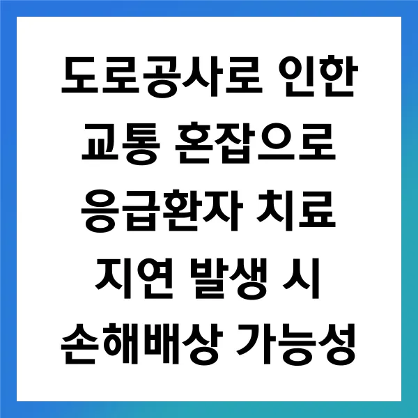 도로공사로 인한 교통 혼잡이 응급환자 치료에 미치는 영향 은 실질적으로 심각한 문제 입니다. 실제로, 2022년 A 병원에서는 도로공사가 진행 중인 지역에서 발생한 응급환자 치료 지연 사례 가 보고되었습니다. 이 환자는 심각한 심장병 으로, 5분 이내에 치료를 받지 않으면 생명이 위태로울 수 있는 상태였습니다. 그러나 도로공사로 인해 이동 중이던 구급차가 약 30분간 정체에 걸리면서, 결국 환자는 치료를 받지 못해 심각한 합병증을 겪게 되었습니다. 이 경우, 환자와 그 가족은 이와 같은 상황에 대한 손해배상을 청구할 수 있는 가능성이 있었습니다.