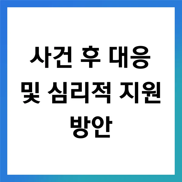 이러한 다양한 대응 및 지원 방안은 피해자가 사건 후 심리적 안정과 회복을 돕는 데 필수적입니다 . 피해자의 안전과 정신적 건강을 지키기 위해서는 무엇보다도 체계적이고 지속적인 지원이 필요합니다. 각 개인의 상황에 맞는 적절한 지원을 찾아 나가는 과정 이 중요하며, 이를 통해 피해자는 자신의 회복 여정을 효과적으로 이어갈 수 있을 것입니다.